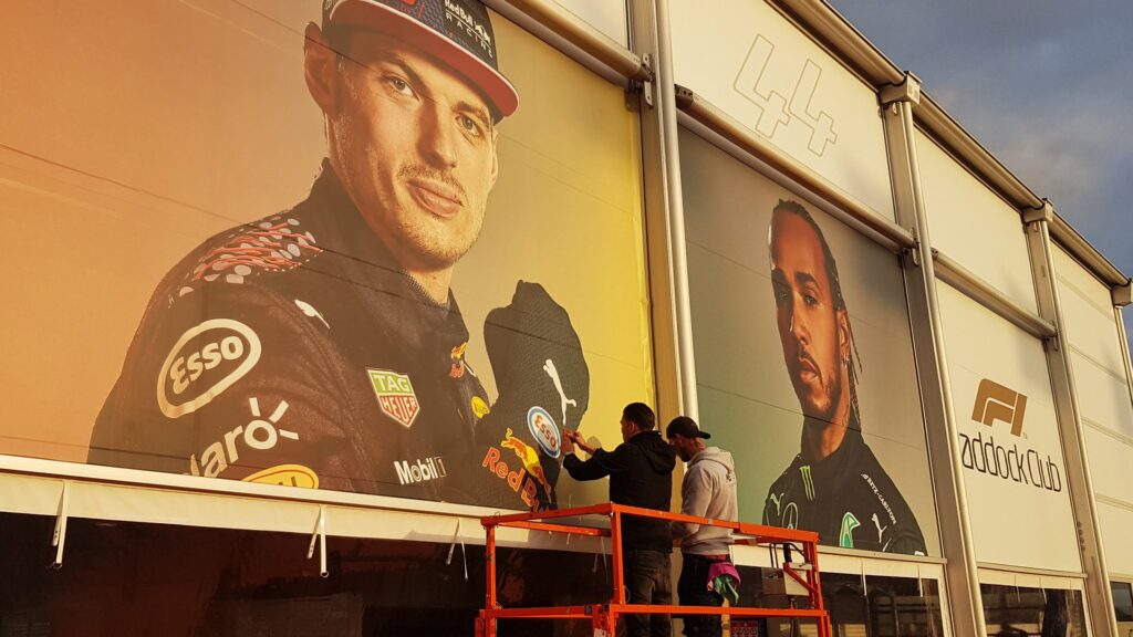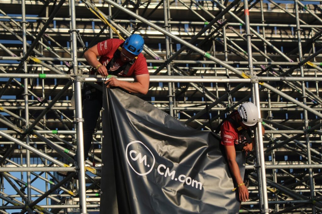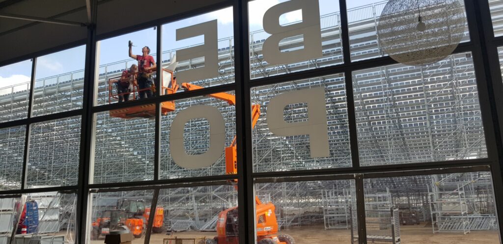Spie-scaf montage voor doeken op de tribunes, houtconstructies voor in Paddock Club, plakken op ramen, diverse peesframes voor gebruik binnen, heel veel aluminium buisconstructies voor plaatsing van doeken.