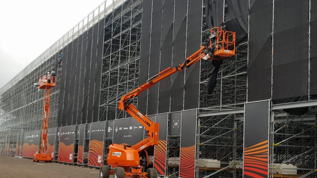 Hoogwerkers, gators, schroefboormachines, ratels en heel veel monteurs.