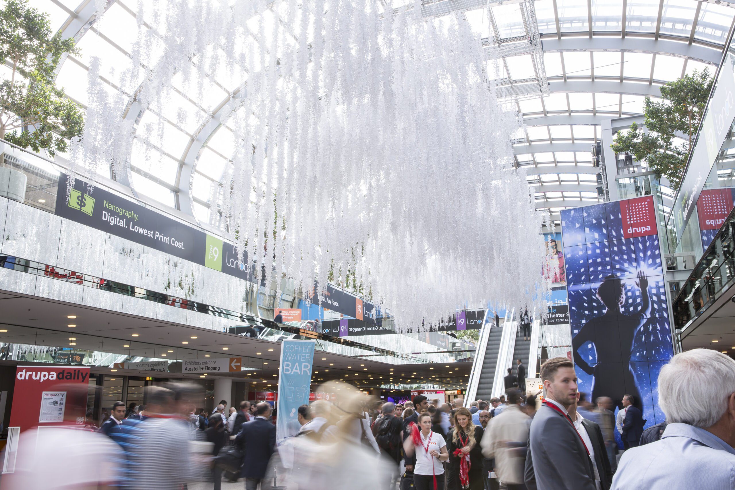De beurshallen (achttien totaal) zijn als vanouds goed gevuld. Het contingent Chinese standhouders is gegroeid en nu verantwoordelijk voor 40 procent van de stands. Verschillende grote merken, die al veel edities aanwezig zijn, hebben minder standruimte dan voorheen. Dat geldt niet voor álle merken. HP is met een volledige hal duidelijk zichtbaar. Ook bedrijven als Canon en Fujifilm hebben grote stands geboekt. Geen toeval als je bedenkt dat juist deze bedrijven tegelijkertijd in heel verschillende disciplines in de grafische markt actief zijn met hun printers.