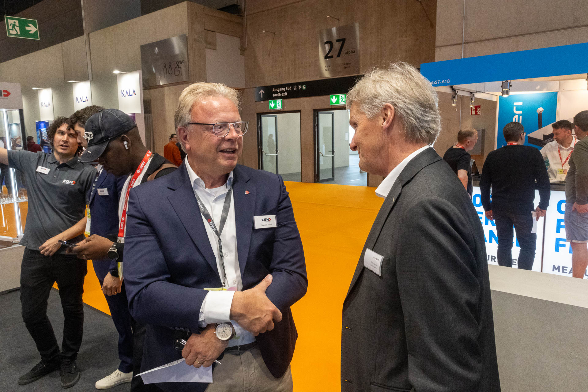 Christoph Gamper (links) en Christian Harder praten op de Durst-stand op Fespa Berlijn de pers bij.
