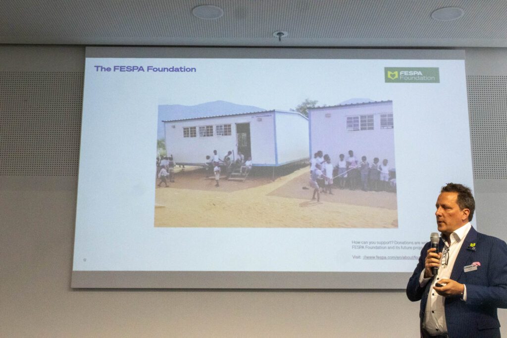 Fespa-CEO Neil Felton legt het programma van de Fespa Foundation uit.