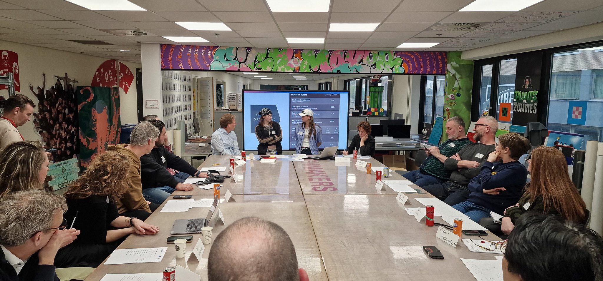 Bijeenkomst van het Platform Signmaker op ROC Amsterdam, waar twee studenten een presentatie geven over de inhoud van hun opleiding. Foto: Lucien van der Eijk.