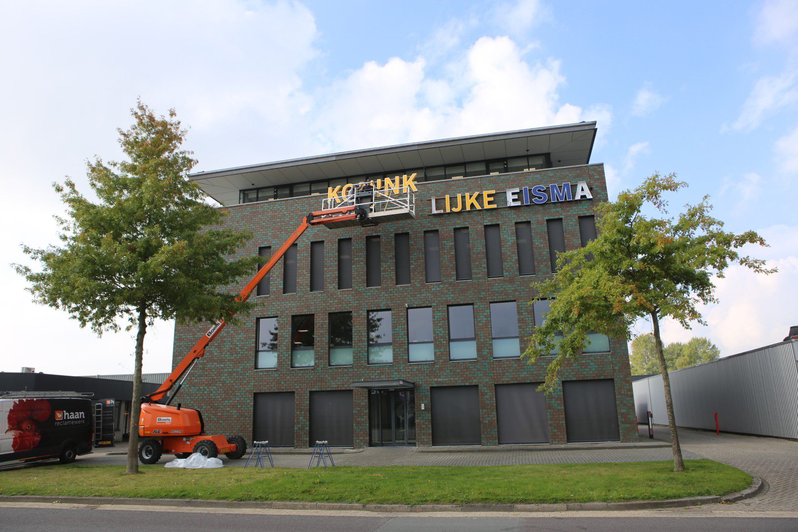 Een logische match, vertelt Fedde Akkerman, verantwoordelijk voor sales en marketing bij het signbedrijf. “Wij verzorgden ook eerdere signing op de panden van Eisma. De herkenbare blauwe neoncontourlijn op het dak van het hoofdkantoor in Leeuwarden is destijds gemaakt door Friesland Reclame, dat sinds eind 2021 onderdeel is van Haan Reclamewerk. Zo sluit alles mooi op elkaar aan.”