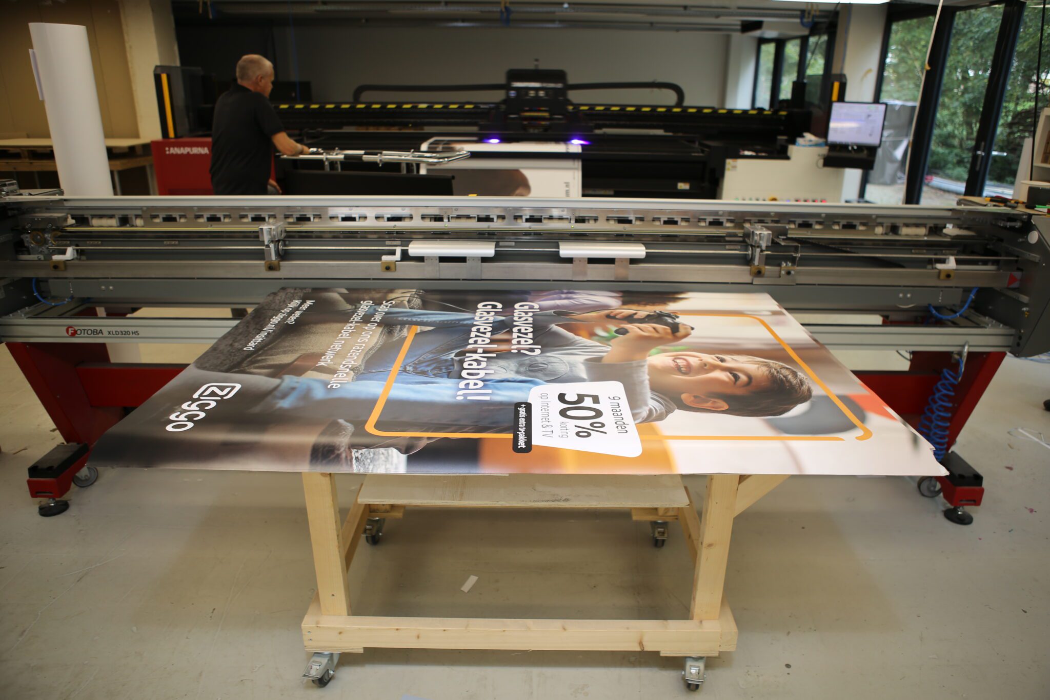 Omdat campagnes steeds sneller naar de markt moeten, investeerde Muller XXL op de vestiging in Amsterdam eind 2019 al in een Anapurna H3200i LED van Agfa. Een hybride machine, maar de mogelijkheid om platen te printen, wordt niet gebruikt. Pol: “We printen op deze machine louter papieren posters voor de out-of-homemarkt. Oplages van maximaal 25 tot 30 exemplaren, daarna schakelen we over op offset. Dat heeft met de snelheid van de machine te maken, maar ook met de kosten per afdruk. We zijn nu veel flexibeler en kunnen ook variabelen, als het moet per exemplaar, digitaal printen.”