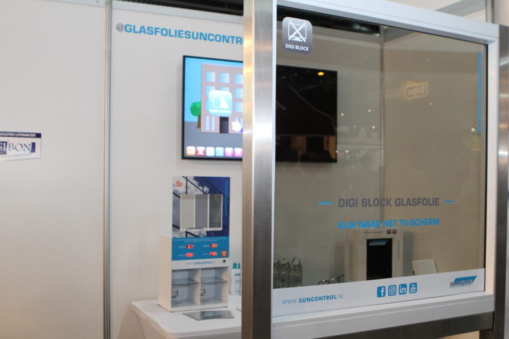 Op de recente Visualize Expo in Gorinchem presenteerde Glasfolie Suncontrol naast de vierseizoenen glasfolie, diverse innovaties. Een van deze producten is de Digiblock glasfolie, een polariserende folie met een ‘black-outeffect’ voor beeldschermen. “Hierdoor kunnen voorbijgangers niet zien wat er op een scherm wordt weergegeven, terwijl ze wel door het glas kunnen kijken.” De folie is afgelopen jaren verder ontwikkeld en biedt nu ook een interessante oplossing voor ziekenhuizen en penitentiaire inrichtingen waar kamers met glas zich tegenover elkaar bevinden met een gang ertussen. Waarhuijs: “Door de folie op het ene raam liggend en op het andere raam staand aan te brengen, ontstaat een effect dat degenen in de tegenoverliggende kamers niet bij elkaar naar binnen kunnen kijken, maar wel degene in de gang zien. Vanuit die gang kun je beide kamers inkijken.”