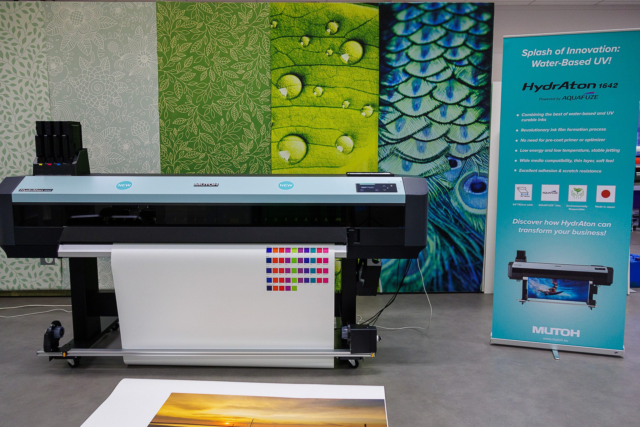 Afgelopen jaar kondigde Fujifilm de Aquafuze inkttechnologie aan. Op drupa werd bekend dat het bedrijf hiervoor samenwerkte met Mutoh, die een printerplatform ontwikkelde voor het gebruik van deze Aquafuze-inkt. Tijdens deze vakbeurs werd de bèta-versie van de Mutoh HydrAton 1642 getoond. Herman Hartman bracht een bezoek aan Mutoh Europe in Oostende om nader kennis te maken met deze printer en het unieke inktconcept, dat nu gereed is voor uitlevering.