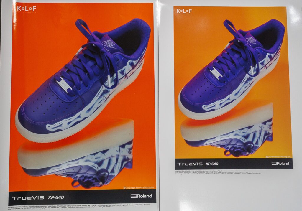 Met de TrueVIS XP-640 kan Roland DG zich goed meten met de competitie in dit marktsegment. Roland heeft de bouwkwaliteit verbeterd, net als de aansturing van de printkoppen. Hierdoor kun je deze printer niet één op één vergelijken met oudere printermodellen. Dat maakt in de praktijk het snelheidsverschil ten opzichte van het eerdere aanbod soms groter dan gemeld. Veel afnemers in onze regio kozen de afgelopen tijd voor de versie met de 8-kleuren inktset, waarmee je kleurrijkere resultaten behaalt. Kies je voor de 8-kleurenversie dan moet je rekening houden met het feit dat je de workflow moet aanpassen om er optimaal profijt van te hebben.