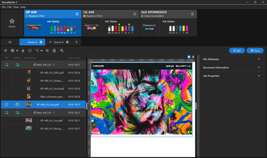De operator heeft door de tijd heen steeds meer hulp gekregen van de software die met de printer wordt geleverd. De huidige TrueVIS-lijn kan het mediatransport, de timing en het afvuren van de inktdruppels zonder tussenkomst van de operator afstellen. Een groot deel van het reinigingsproces gebeurt automatisch, al blijft het nodig om zowel de printkoppen als het onderhoudsstation handmatig te reinigen. Bij de XP-640 wordt versie 7 van de VersaWorks RIP bijgeleverd. Deze RIP heeft een vernieuwde interface die zorgt voor meer overzicht van de instellingen en snellere toegang tot functies die voorheen soms verschillende niveaus diep in submenu’s verborgen zaten. De VersaWorks 7 RIP is sinds eind maart beschikbaar in een native Mac-versie naast de Windows 11-versie, zodat de performance op beide platforms optimaal is.