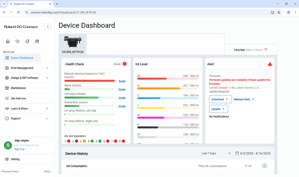 Roland DG maakt al langer gebruik van de cloud voor het uitwisselen van informatie tussen hun printers en de gebruikers/printeigenaren, en tussen printers en servicetechnici van de dealer (waarvoor je als gebruiker eerst toestemming moet geven). Dit alles wordt gebundeld onder DG Connect, een app die via je smartphone of tablet werkt en toegang geeft tot je Roland-printer(s).