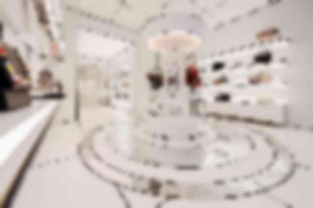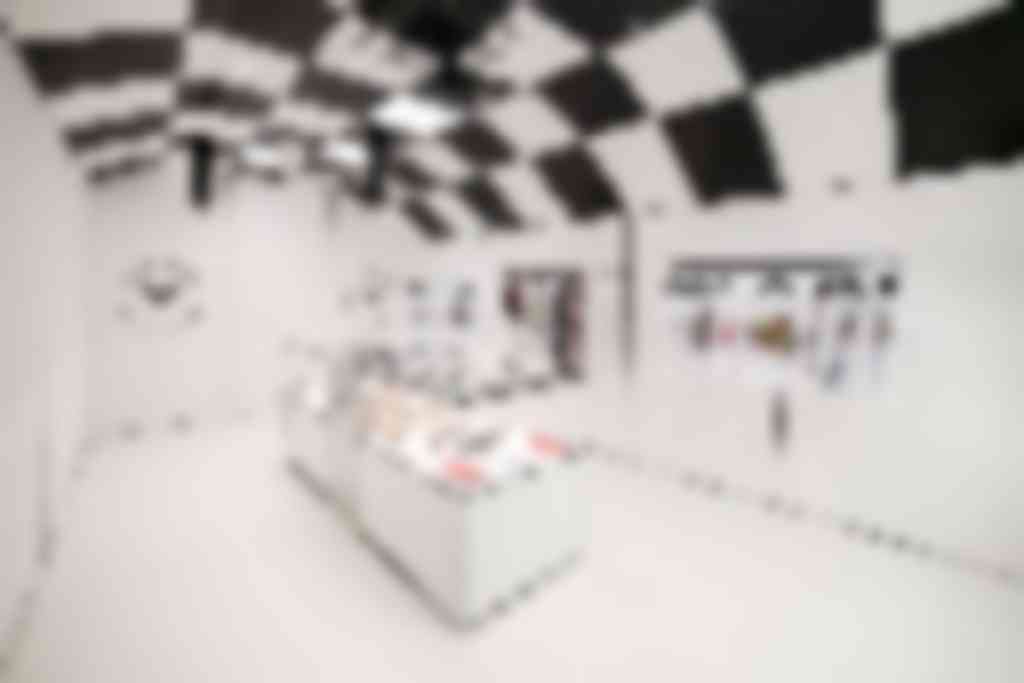 Foto: Een Italiaanse modewinkel met een schaakbord als plafond, gemaakt met behulp van interieurfolie, geleverd door Spandex.