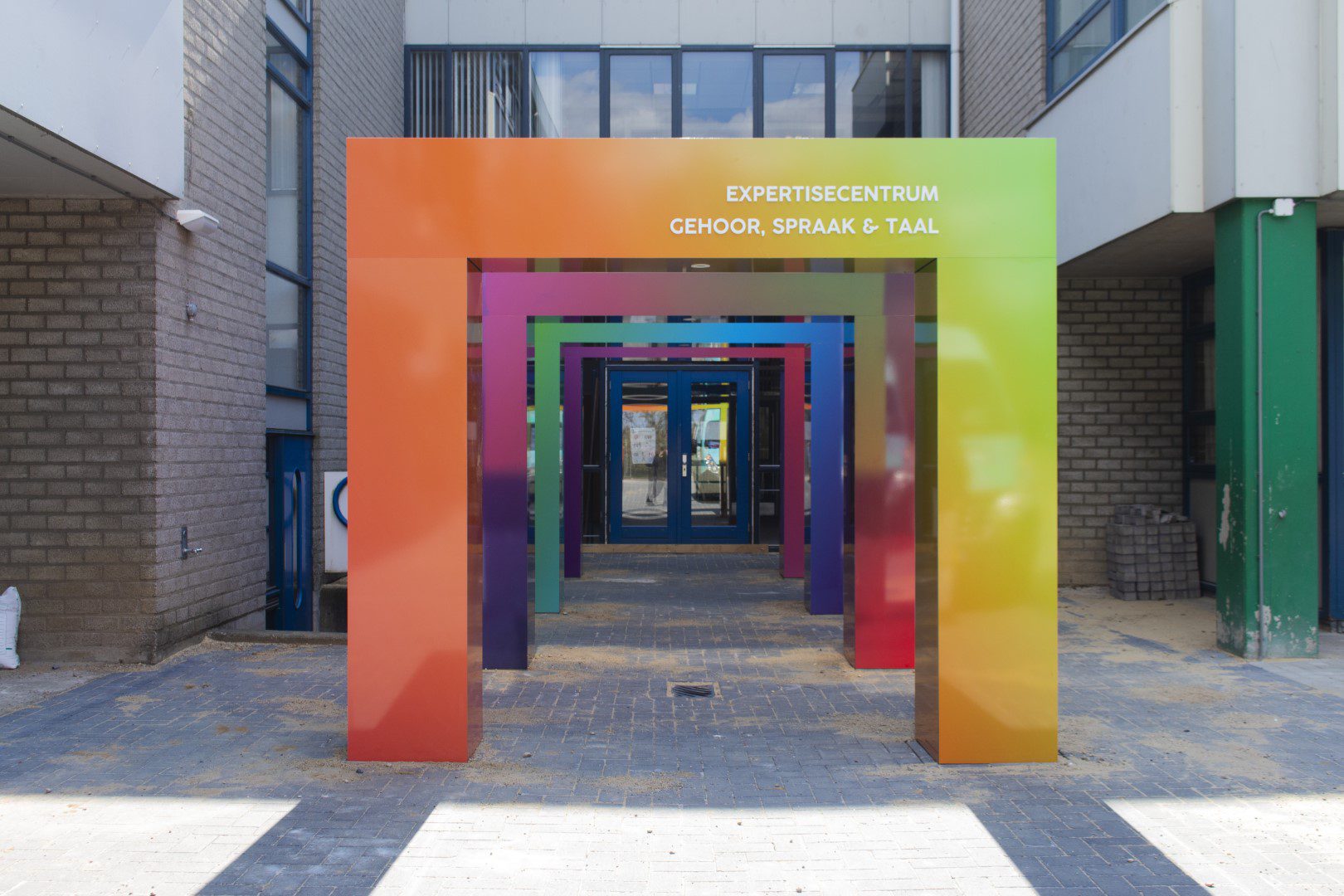 Van Stichting Onderwijs Midden-Limburg kreeg De SignFabriek de opdracht om vier kleurrijke toegangsbogen te ontwerpen, passend bij de bestaande huisstijl van de drie organisaties die in dit gebouw zijn gevestigd. De bogen bestaan uit een aluminium gelaste constructie die zijn ingepakt met 3 mm dibond platen. De platen zijn voorzien van een fullcolour print. De inkt wordt beschermd tegen weersinvloeden en UV-licht door glanslaminaat. Op de eerste boog zijn freesletters aangebracht van 8 mm dik Acrylox.