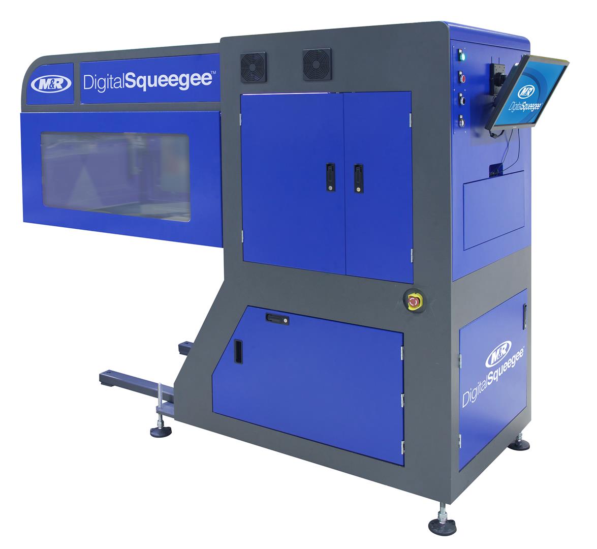 M&R’s Digital Squeegee is een printer die is ontwikkeld voor korte runs op hoge snelheid met veel kleuren en waaraan hoge eisen worden gesteld. De printer is uitgerust met 21.248 nozzles in 8 industriële printkoppen die inktdruppels tot 30.000 keer per seconde kunnen afvuren.