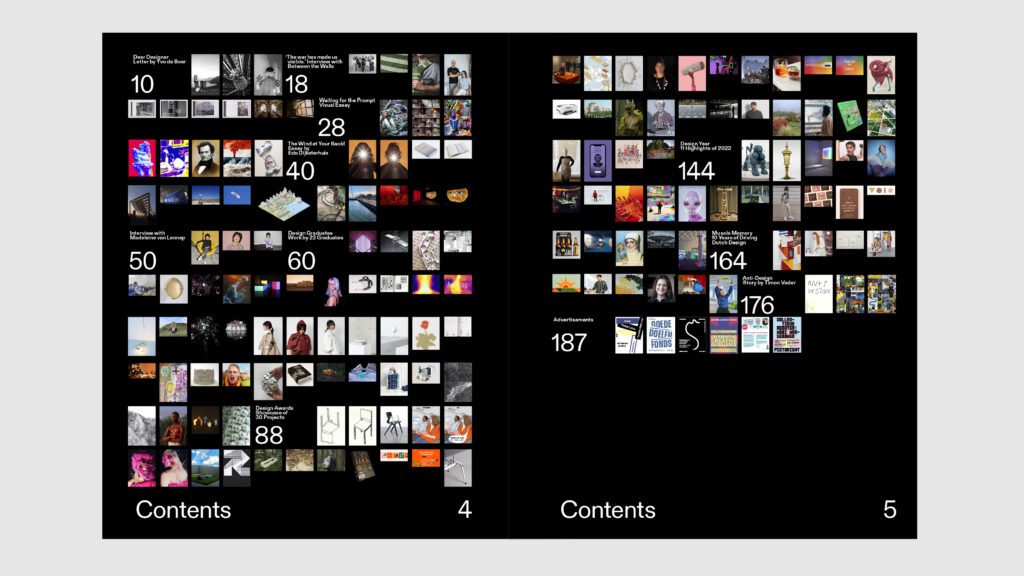 Dutch designers Yearbook ’22 belicht het designjaar onder het motto chaos en kijkt vooruit. Het boek geeft een inkijk in wat designers denken en maken: via essays van klimaatdiplomaat Yvo de Boer en journalist Jeroen Junte, bevlogen eindexamenwerk van Nederlandse ontwerpopleidingen, prijswinnende designcases, een beeldessay over kunstmatige intelligentie, portretten van beeldbepalende designers als Petra Blaisse, Chequita Nahar en tinker imagineers, het jubilerende ontwikkelingstraject Driving Dutch Design, en interviews met o.a. de Oekraïense studio Between the Walls, solar designers Marjan van Aubel en Pauline van Dongen, en scheidend BNO-directeur Madeleine van Lennep.