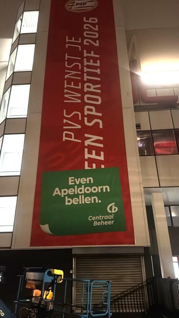 Op de megabanner van 5 x 20 meter leek niet PSV, maar ‘PVS’ supporters een sportief 2026 toe te wensen. Een spelfout die de afgelopen dagen prompt viraal ging. Het blijkt echter om een ludieke actie van verzekeraar Centraal Beheer, in samenwerking met de voetvalclub uit Eindhoven, te gaan.