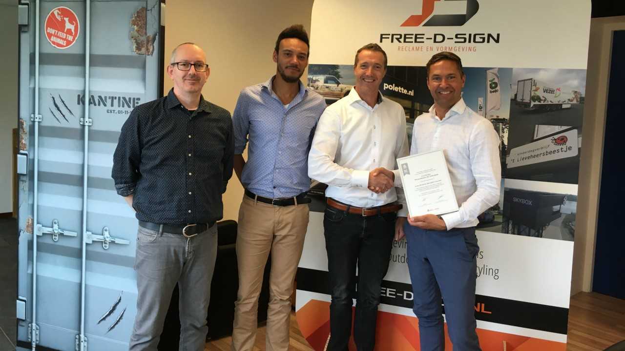 “Van de ruim 2.000 signbedrijven in Nederland, zijn er maar zes met dit certificaat. En daarvan zijn wij er nu één. Elke dag weer werken we met zijn allen aan het leveren van de hoogste kwaliteit. Het getuigschrift is het bewijs naar onze klanten dat wij dat ook inderdaad dóen.”