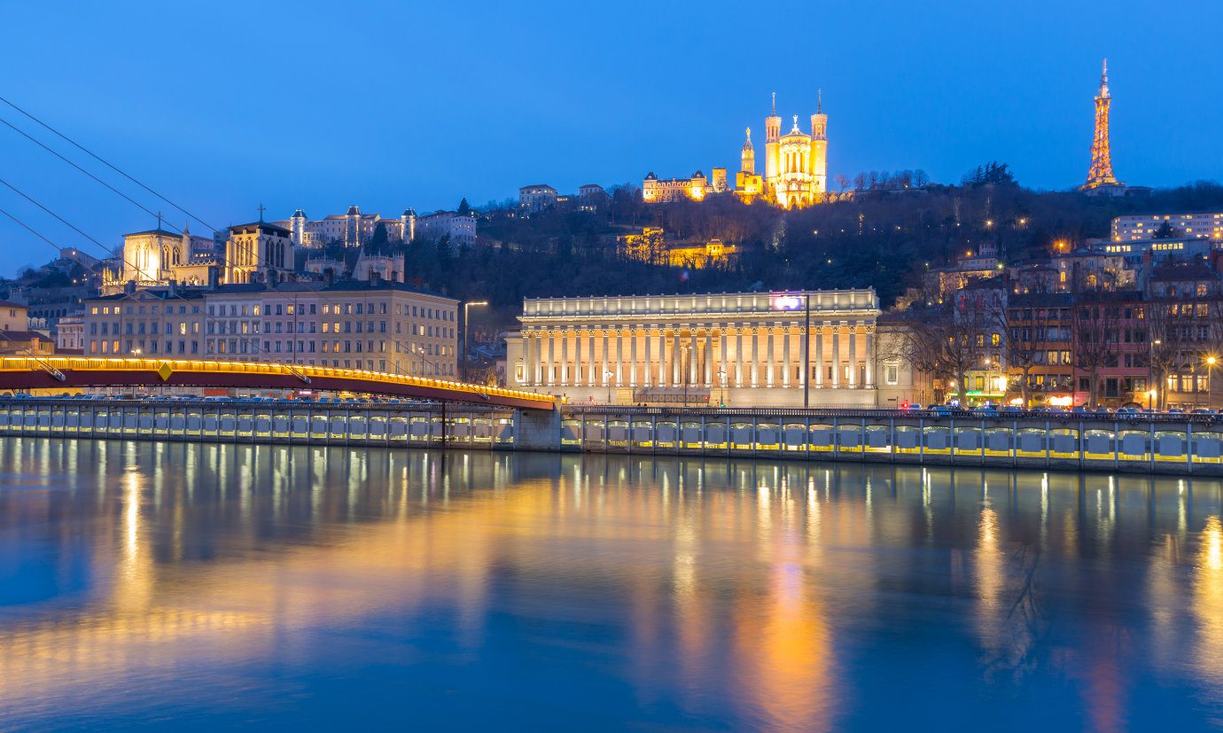 nacht. en Notre-Dame De Lyon Basilica (foto: Saone de Fourviere bij rvier