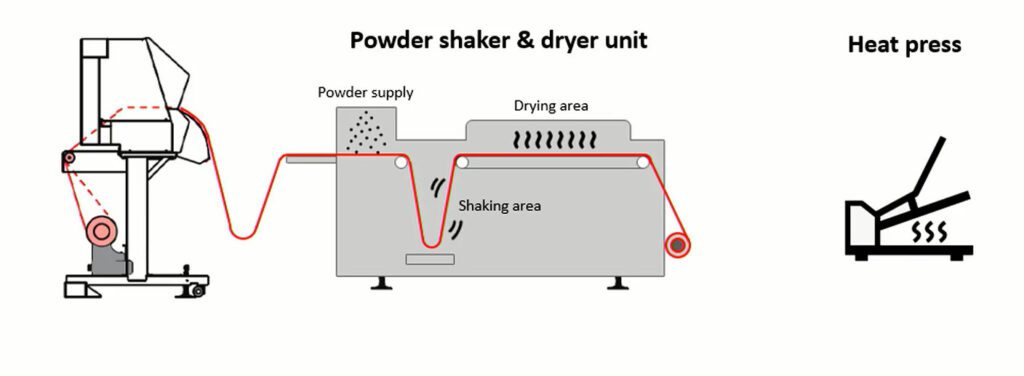 Het ontwerp wordt eerst rechtstreeks op een speciale transferfolie geprint, die met smeltpoeder wordt bestrooid. Na verhitting en droging is de transferfolie klaar en kan het met een hittepers op de stof worden aangebracht. Het is een goed alternatief voor DTG-printen, vinyl transfers of zeefdruk(transfers). In tegenstelling tot hittetransfer met dye-sublimatie-inkten, is DTF veelzijdiger als het gaat om de te gebruiken materialen. Er kan met meer dan alleen polyester en TC-gemengde materialen worden gewerkt en zowel licht als donker gekleurde stoffen worden gebruikt.