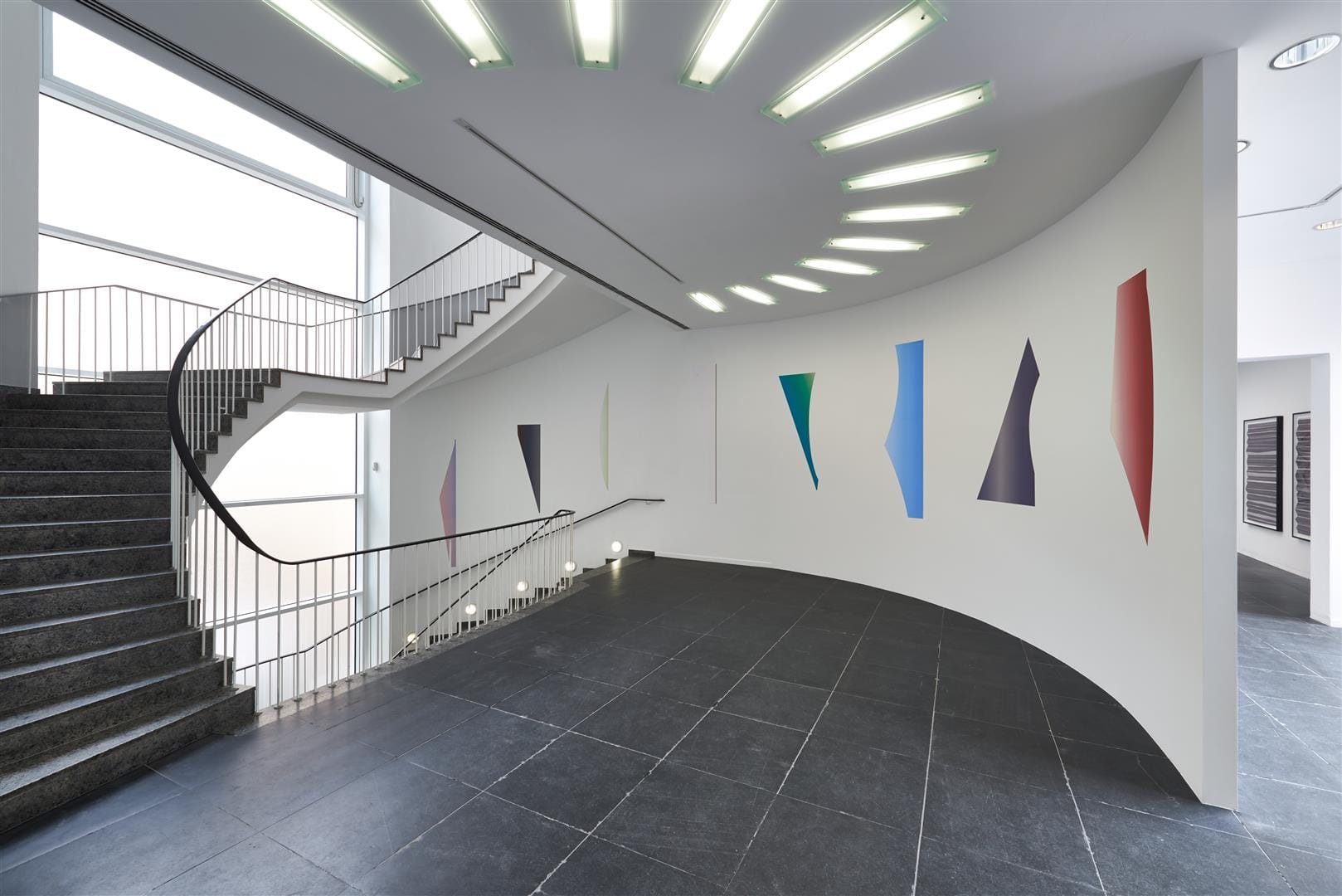 De muren van het Frankfurter Kunstverein zijn voorzien van complexe geometrische vormen, in subtiele kleurovergangen tegen een witte achtergrond.