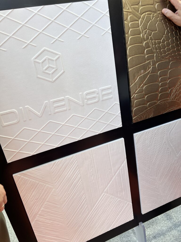 De Dimense-technologie kan worden ingezet op behangpapier of textiel en met verschillende afwerkingen, zoals mat, suède, goud/zilver en parelmoer. De extra structuur die kan worden geprint, accentueert subtiel details, waardoor een verbluffend visueel en tastbaar 3D-effect ontstaat. “Met onbeperkte creatieve vrijheid is elk ontwerp uniek. Ideaal voor kantoren, restaurants, winkels of hotels die een spannende of opvallende uitstraling kunnen gebruiken”, aldus Vink VTS in een wervende toelichting op de demodag.