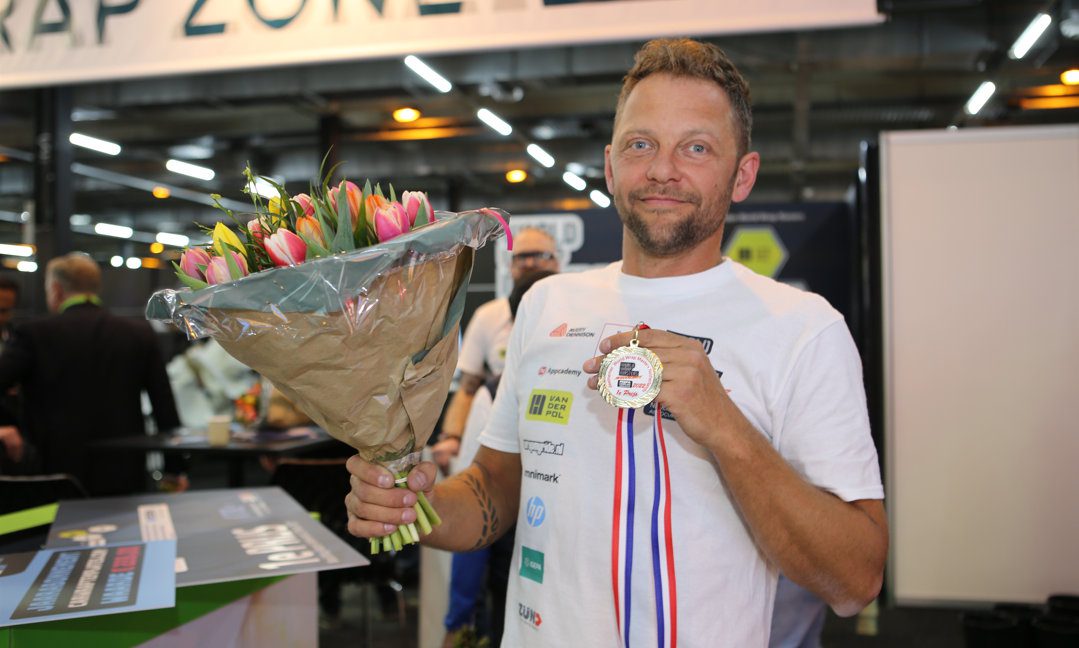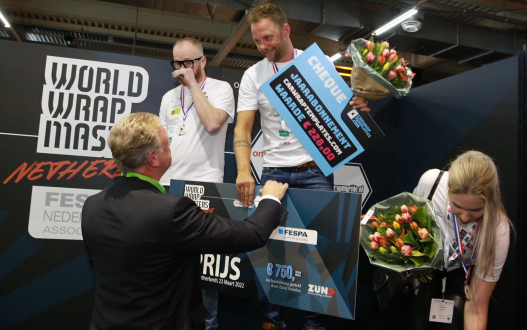 Patrick Vermeulen mag namens Nederland deelnemen aan de World Wrap Masters Europe die van 31 mei t/m 3 juni in Berlijn tijdens de Fespa Global Print Expo wordt gehouden. Naast de titel en het eremetaal, dat hij uit handen kreeg van Wouter van As, voorzitter van Fespa Nederland, wacht hem een geldbedrag van 750 euro. De symbolische cheque werd overhandigd door Stephan Jacobs, directeur van Zünd Benelux, die voor de nummer twee 500 euro had meegenomen en voor de nummers drie en vier elk 250 euro. Alle vier finalisten kregen ook nog een jaarabonnement op Carwraptemplates.com ter waarde van 228 euro van Marcel Vermeulen.