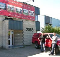 Zaakvoerder Jan Coomans van Esbi belgium (links), samen met planner Jos Beckers voor het pand.