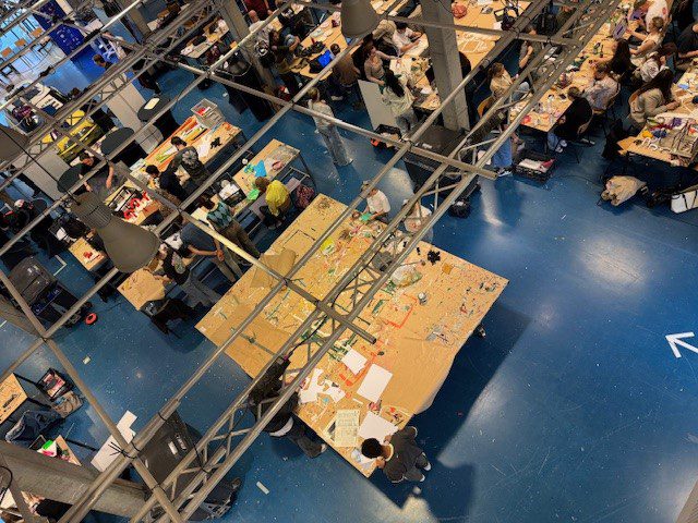 Studenten aan het werk tijdens de workshops in het atrium van de De Rooi Pannen in Tilburg.