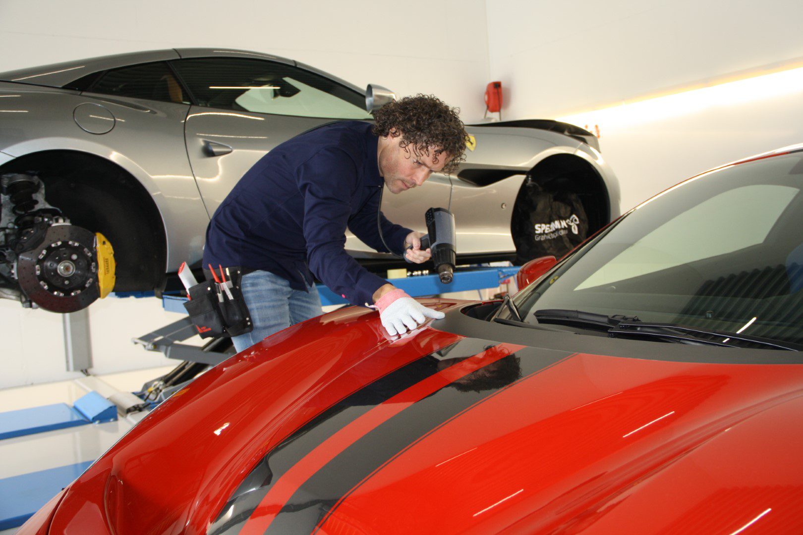 Twee Ferrari’s worden bij Speelman Graphic Applications in Deventer voorzien van beschermfolie. Ook tegen ongewenste indringers zijn ze goed beschermd, want het pand is voorzien van uitgebreide beveiliging.