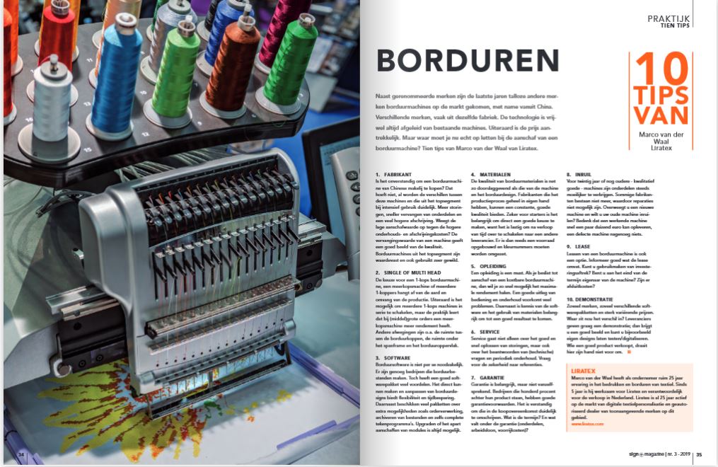 Naast gerenommeerde merken zijn de laatste jaren talloze andere merken borduurmachines op de markt gekomen, met name vanuit China. Verschillende merken, vaak uit dezelfde fabriek. De technologie is vrijwel altijd afgeleid van bestaande machines. Uiteraard is de prijs aantrekkelijk. Maar waar moet je nu echt op letten bij de aanschaf van een borduurmachine? Tien tips van Marco van der Waal van Liratex.