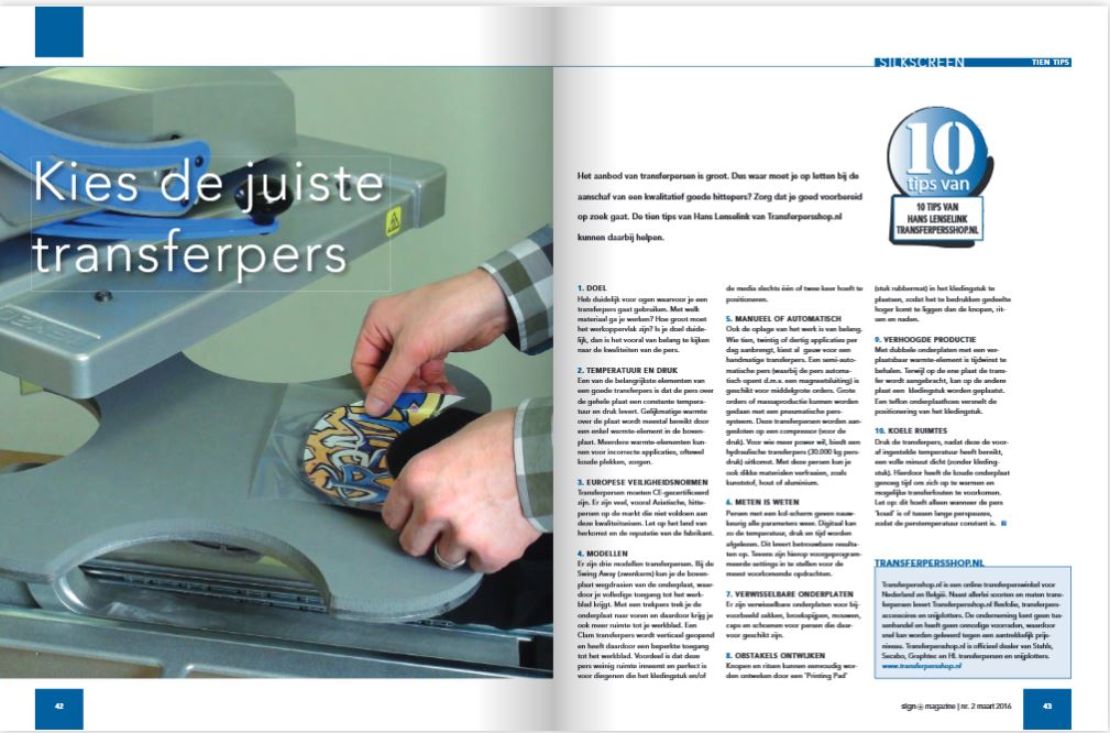 Het aanbod van transferpersen is groot. Dus waar moet je op letten bij de aanschaf van een kwalitatief goede hittepers? Zorg dat je goed voorbereid op zoek gaat. De tien tips van Hans Lenselink van Transferpersshop.nl kunnen daarbij helpen.