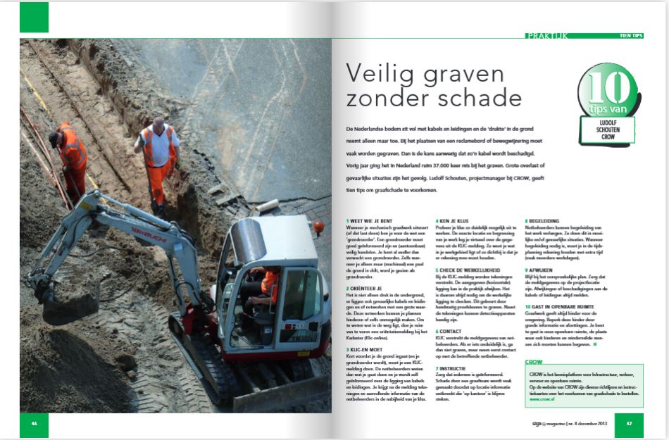 De Nederlandse bodem zit vol met kabels en leidingen en de ‘drukte’ in de grond neemt alleen maar toe. Bij het plaatsen van een reclamebord of bewegwijzering moet vaak worden gegraven. Dan is de kans aanwezig dat zo’n kabel wordt beschadigd. Vorig jaar ging het in Nederland ruim 37.000 keer mis bij het graven. Grote overlast of gevaarlijke situaties zijn het gevolg. Ludolf Schouten, projectmanager bij CROW, geeft tien tips om graafschade te voorkomen.